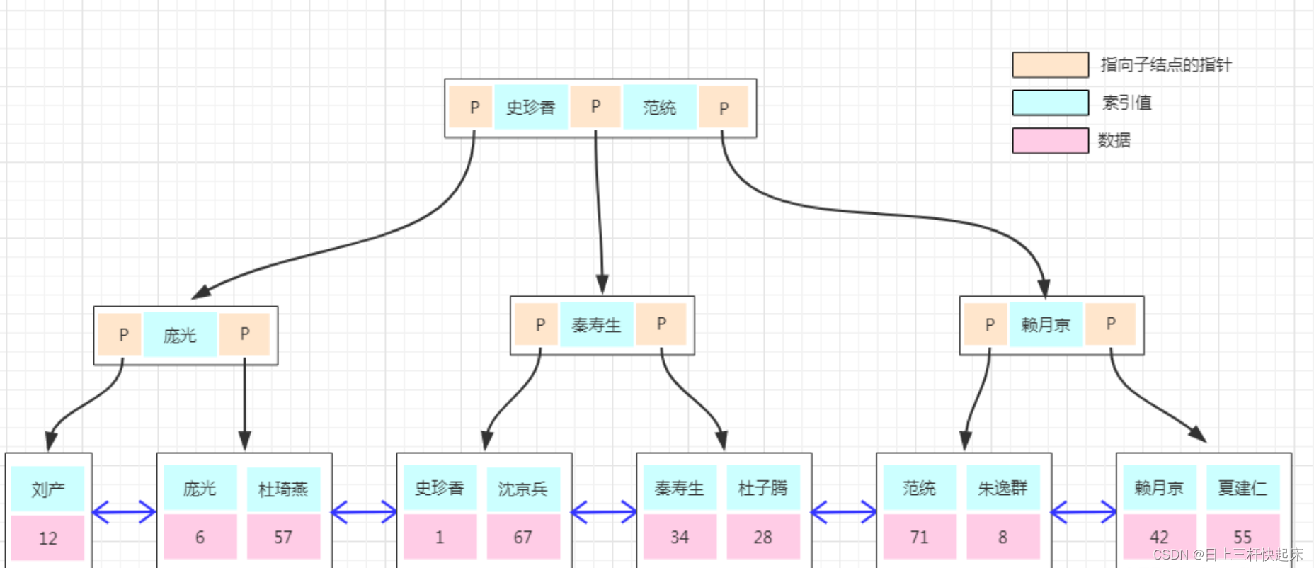 - 支持范围查询:叶子节点的链表结构使得B+树特别适合执行范围查询,能够快速地遍历指定范围的所有值。