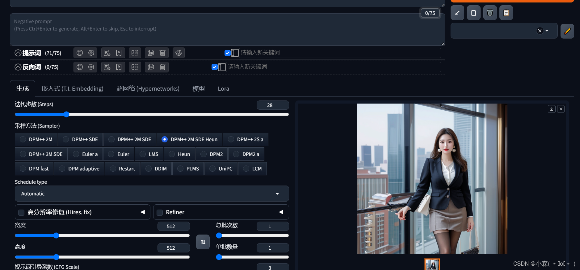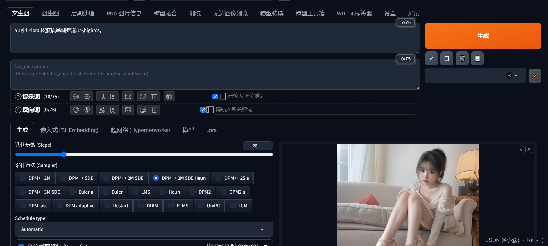 关于DPM算法:这是我们在stable diffusion用的最多的方法,我们按照时间速度来筛选的话,我们直接选择DPM++ 且后面跟着Karras的算法就可以了。比如:DPM++2M Karras 。