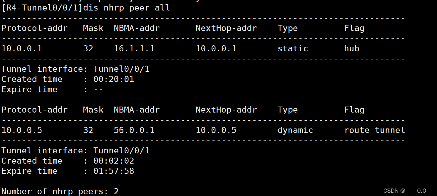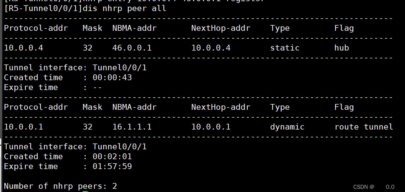 [R1-Tunnel0/0/1]nhrp entry 10.0.0.5 56.0.0.1 register