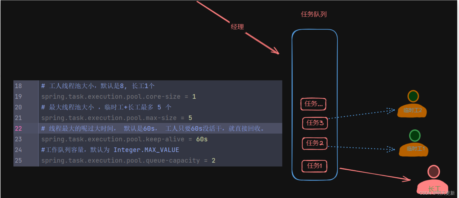 ThreadPoolTaskScheduler。当应用中使用@Scheduled注解来定义和执行定时任务时,这个线程池负责调度和执行这些定时任务。配置这个线程池的大小(如size属性),意味着你可以控制并发执行定时任务的线程数量,以此来优化系统资源利用,特别是在有多项定时任务需要并行执行时。spring.task.execution.pool: 这个配置是针对 Spring 异步任务执行器