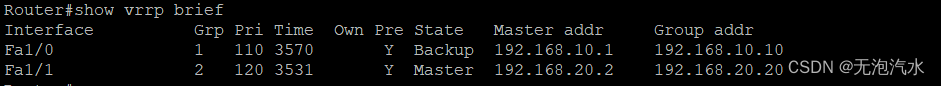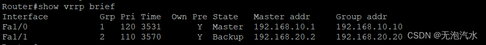 Router(config)#int f1/0 Router(config-if)#no shutdown 启用接口 Router(config-if)#ip address 192.168.10.1 255.255.255.0 实际接口的ip地址 Router(config-if)#vrrp 1 ip 192.168.10.10 定义VRRP组:1,维护的网关地址:192.168.10.10 Router(config-if)#vrrp 1 priority 120 默认优先级为100,优先级范围为0-255,优先级数值大的成为主设备 Router(config-if)#exit - Router(config)#int f1/1 Router(config-if)#no shutdown Router(config-if)#ip address 192.168.20.1 255.255.255.0 实际接口的ip地址 Router(config-if)#vrrp 2 ip 192.168.20.20 定义VRRP组:2,维护的网关地址:192.168.20.20 Router(config-if)#vrrp 2 priority 110 设置VRRP的优先级 - Router(config-if)#end Router#show vrrp brief