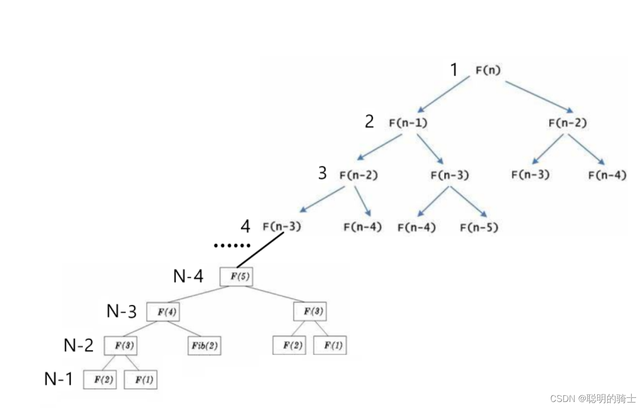 这个程序会先沿着最左侧的路线向下递进,每一次函数的使用都需要开辟栈帧,而每一次调用这个函数使用的内存大小是相对固定的。在执行完F(1)时,F(1)部分的空间就被回收了,因为没有一个调用的深度可以超过F(1),所以算法额外使用的空间最多为N个大小相对固定的栈帧,也就是说空间复杂度为O(N)