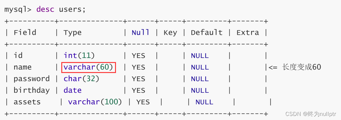 mysql> alter table users modify name varchar(60);