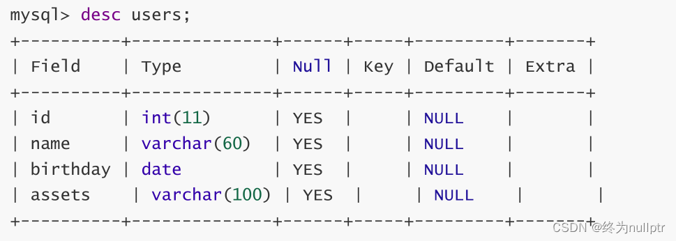 mysql> alter table users add assets varchar(100) comment '图片路径' after
