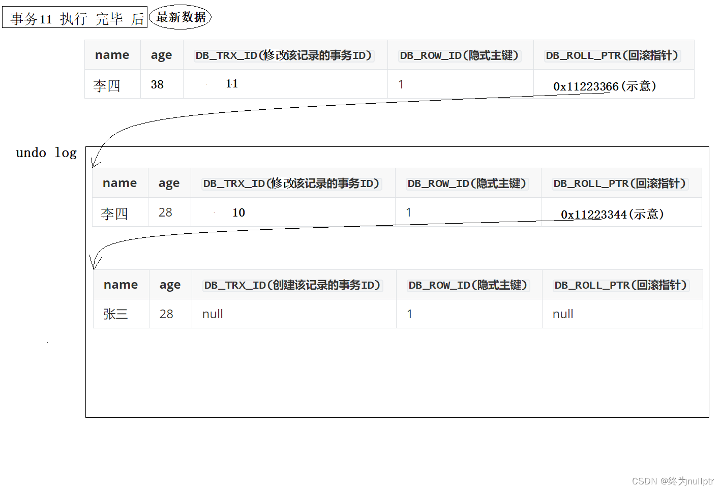 现在修改原始记录中的age,改成 38。并且修改原始记录的隐藏字段 DB_TRX_ID 为当前 事务11 的ID。而原始记录的回滚指针 DB_ROLL_PTR 列,里面写入undo log中副本数据的地址,从而指向副本记录,既表示我的上一个版本就是它。