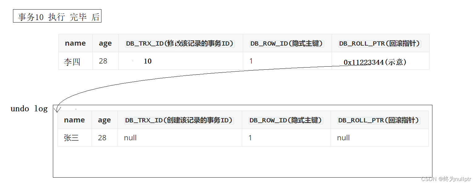 记录的隐藏字段 DB_TRX_ID 为当前 事务10 的ID, 我们默认从 10 开始,之后递增。而原始记录的回滚指针 DB_ROLL_PTR 列,里面写入undo log中副本数据的地址,从而指向副本记录,既表示我的上一个版本就是它。