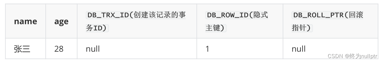 目前并不知道创建该记录的事务ID,隐式主键,我们就默认设置成null,1。第一条记录也没有其他
