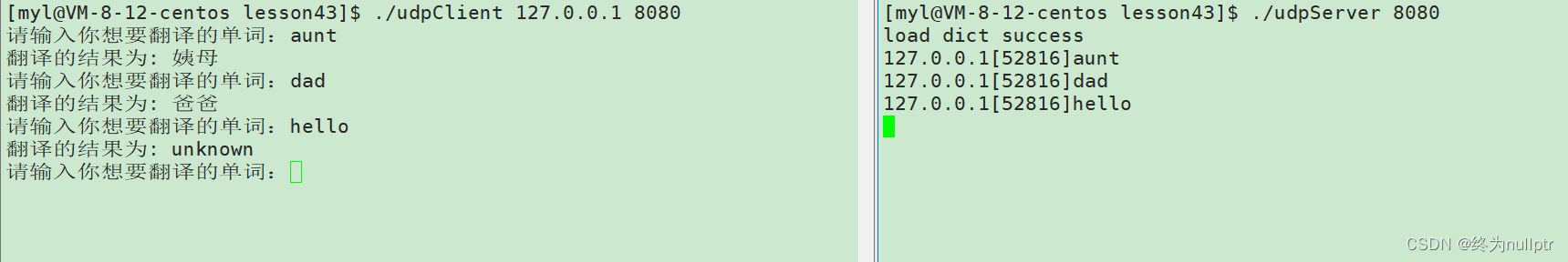 如图所示:服务端能够准确处理客户端的请求,将翻译查询结果返回给客户端