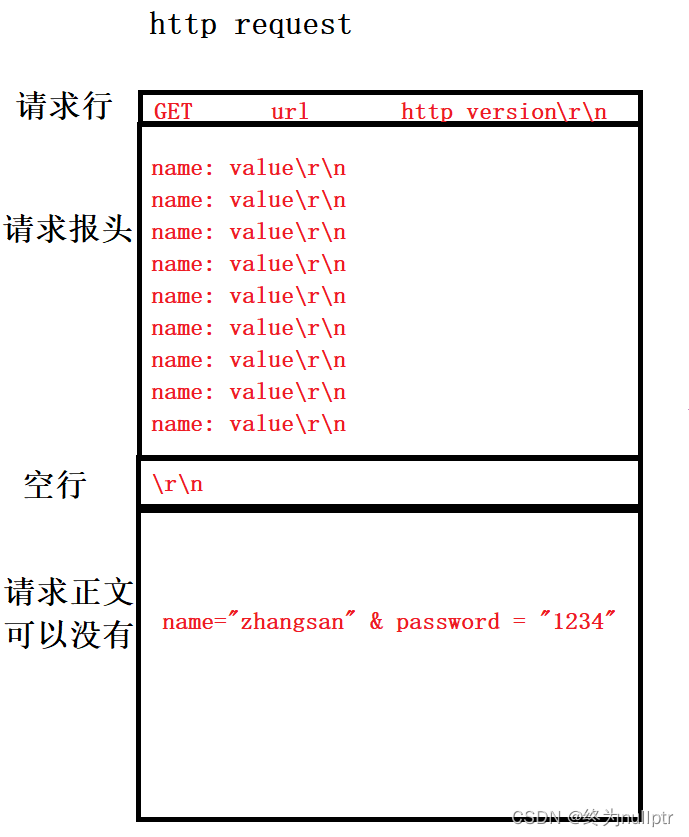 既然HTTP协议是基于TCP协议实现的,那么必然要解决定制协议和序列化和反序列化的过程,首先定制协议是为了在应用层完整的读取到一个报文,按照HTTP的请求宏观结构: