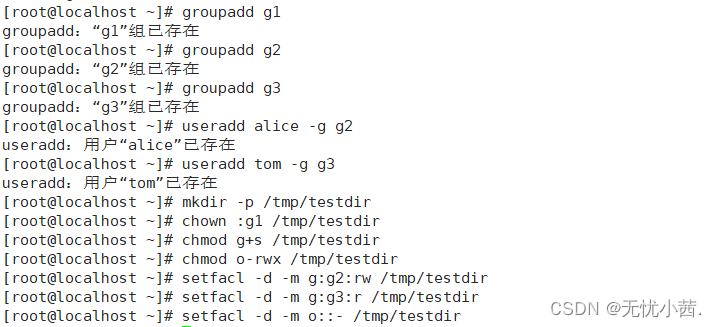 3、要求在/tmp/testdir里创建的新文件自动属于g1组,组g2的成员如alice能对这些新文件有读写权限,组g3的成员如tom只能对新文件有读权限,其他用户(不属于g1,g2,g3)不能访问这个文件夹