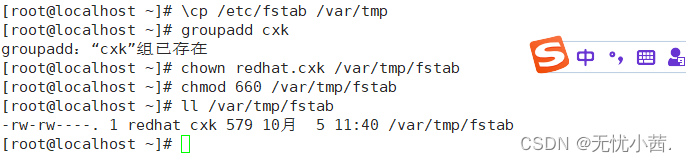 2、复制/etc/fstab文件到/var/tmp下,设置文件所有者为redhat,有读写权限,所属组为cxk组,有读写权限,其他人无权限