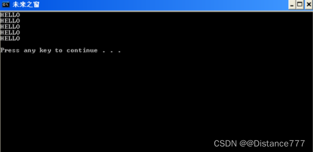 ;FILENAME: EXA121.ASM .486 ; 告诉编译器使用 486 指令集 DATA SEGMENT USE16 ; 数据段开始 MESG DB 'HELLO' ; 存储字符串'HELLO' DB 0,0,0 ; 储存3个0 DATA ENDS ; 数据段结束 CODE SEGMENT USE16 ; 代码段开始 ASSUME CS:CODE,DS:DATA ; 设置代码和数据段寄存器的关系 BEG: MOV AX,DATA ; 将数据段地址加载到寄存器 AX MOV DS,AX ; 将数据段地址存入 DS 段寄存器 MOV ES,AX ; 将数据段地址存入 ES 段寄存器 MOV CX,5 ; 将计数器寄存器 CX 设置为 5 LL1: MOV MESG+5,0DH ; 将 MESG 数据的第5个位置为回车符 MOV MESG+6,0AH ; 将 MESG 数据的第6个位置为换行符 MOV MESG+7,'$' ; 将 MESG 数据的第7个位置为'$' CALL DISP ; 调用 DISP 过程 MOV MESG+5,0 ; 将 MESG 数据的第5个位置清零 MOV MESG+6,0 ; 将 MESG 数据的第6个位置清零 MOV MESG+7,0 ; 将 MESG 数据的第7个位置清零 LOOP LL1 ; 循环,直到 CX 寄存器为 0 MOV AH,4CH ; 将系统调用号存入 AH 寄存器 INT 21H ; 调用 DOS 功能,结束程序 DISP PROC ; 定义过程 DISP MOV AH,9 ; 将功能号存入 AH 寄存器 MOV DX,OFFSET MESG ; 将 MESG 数据的偏移地址存入 DX 寄存器 INT 21H ; 调用 DOS 功能,显示 MESG 中的内容 RET ; 从过程 DISP 返回 DISP ENDP ; DISP 过程结束 CODE ENDS ; 代码段结束 END BEG ; 程序结束最终结果