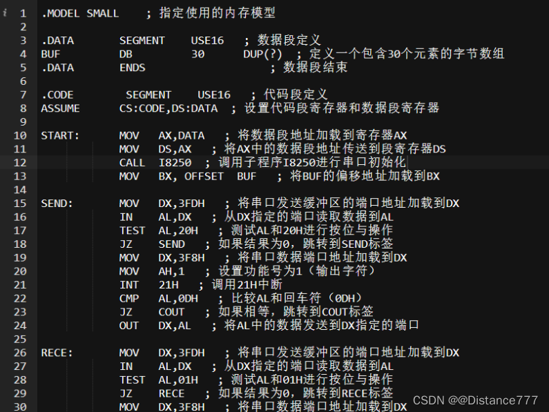 (这是一个用于实现串口通信的汇编程序,通过串口发送和接收数据。程序首先进行串口初始化,然后通过串口发送和接收数据,并在接收到回车时会显示输出缓冲区的内容。最后,使用功能码为4CH的中断结束程序。)