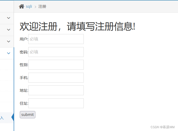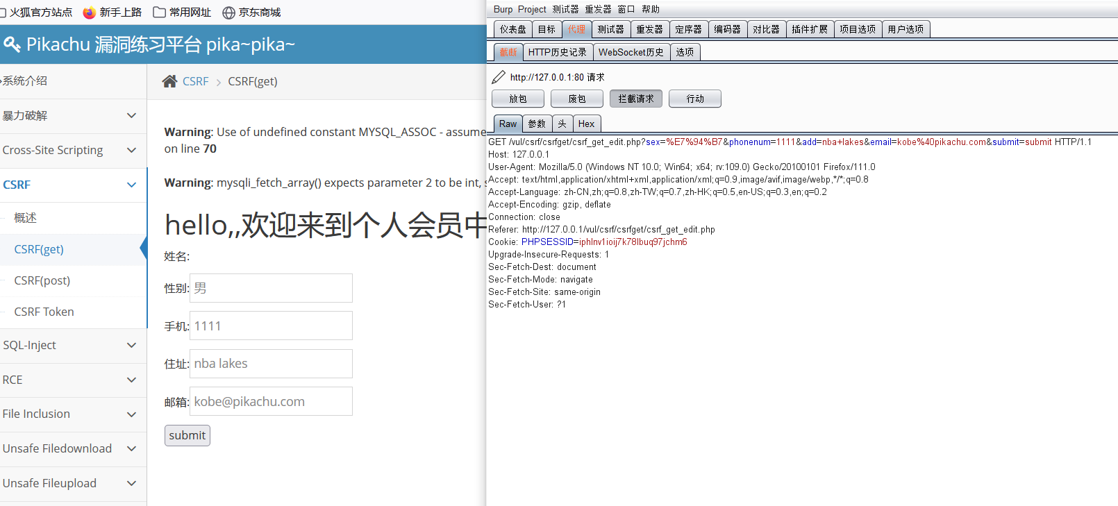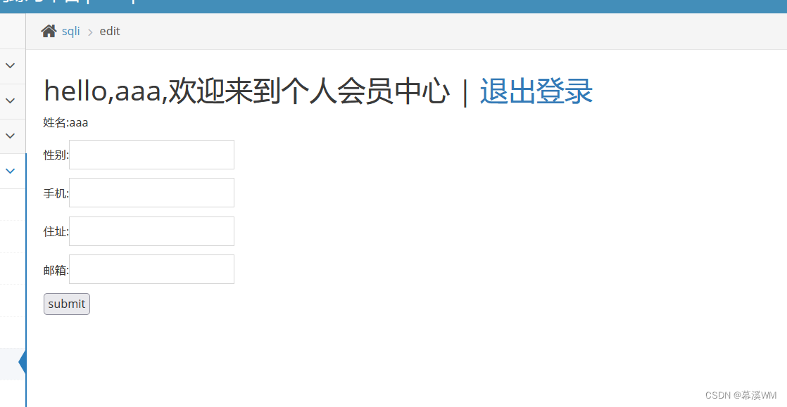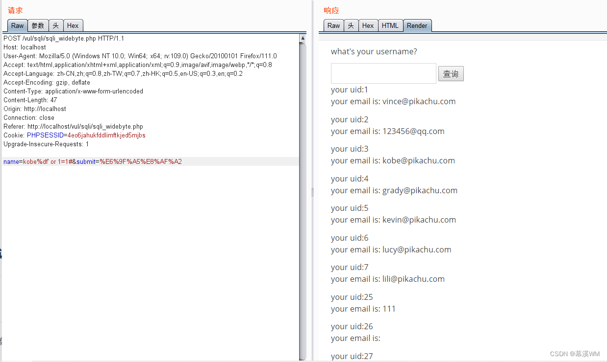 2)测试宽字节注入,和联合注入是一样的只是在内容后面添加%df即可,通过在内容输入处输入内容,然后修改。