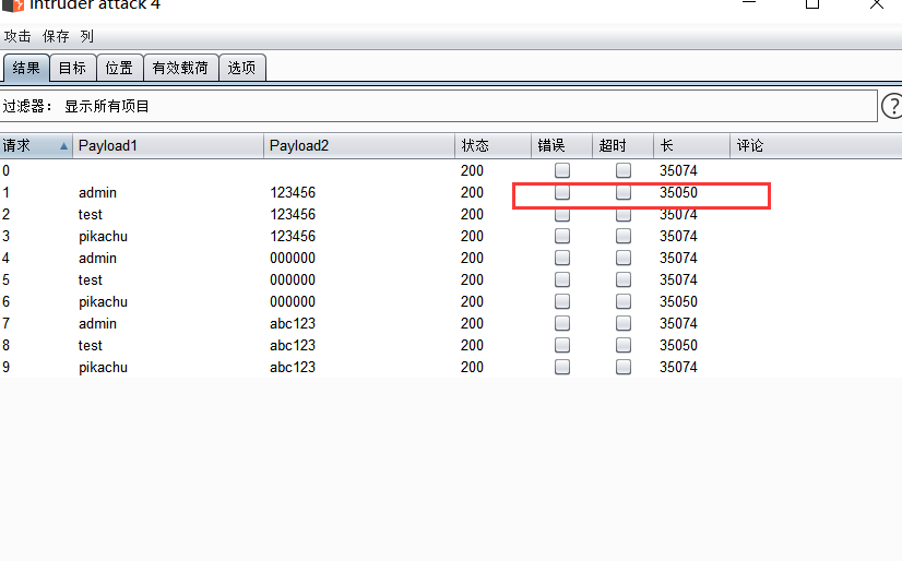 然后开始攻击,返回长度与其他不一样的一组即为正确的账号密码