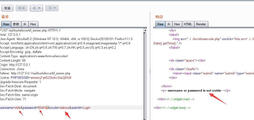 然后我们修改账号密码,验证码不动,再发送,还是提示账号密码不存在。但是却不提示验证码错误。说明我们修改账号密码登录,验证码不过期,可以重复使用。