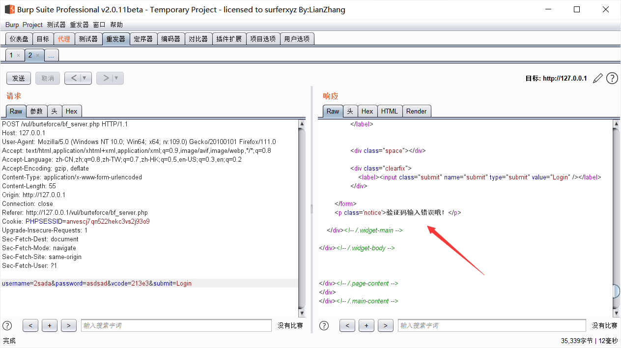 把数据包发送给重发器,修改数据包中的验证码,然后发送,在右边响应栏可以看到,验证码输入错误的提示,说明后台会对验证码进行验证。