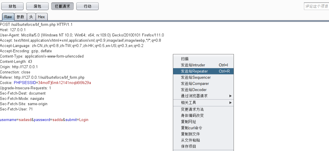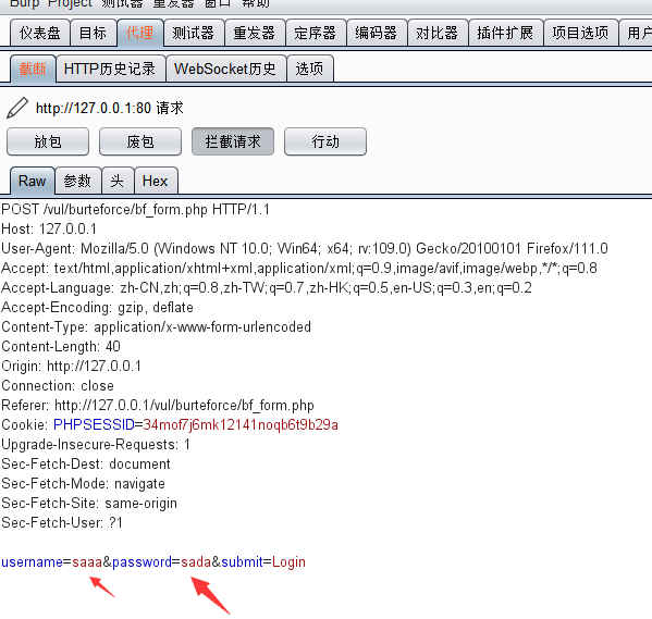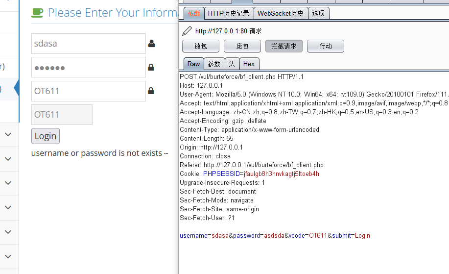 首先随机输入用户名密码和正确的验证码,burp拦截抓包