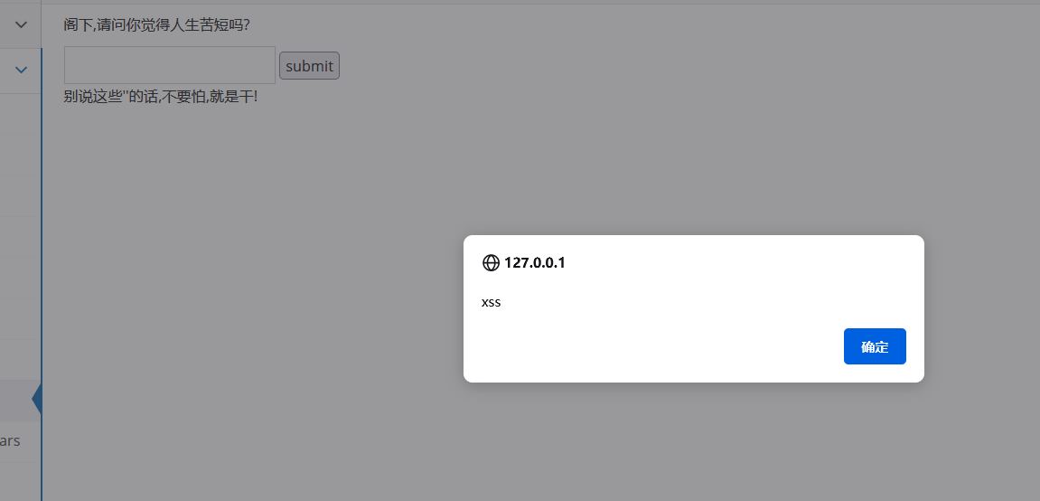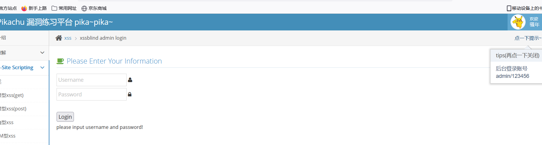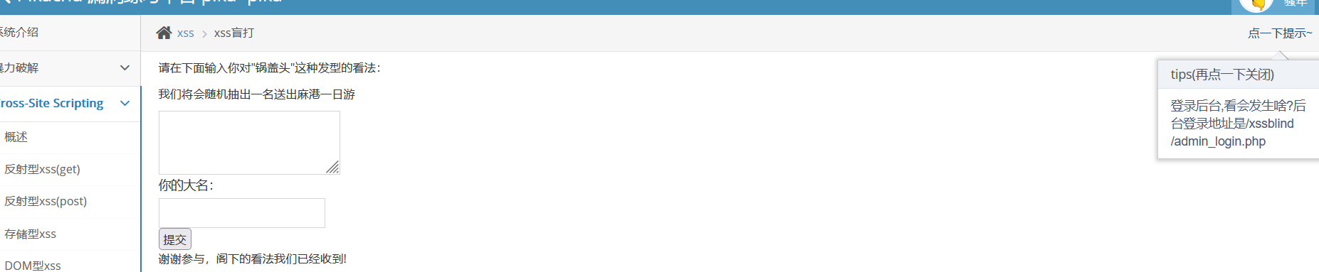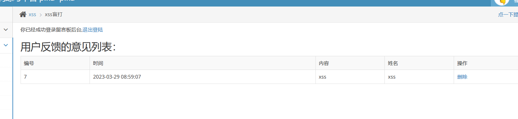 再次登录后台,一登陆就出现弹窗,管理员被攻击到。这种情况就是xss盲打,对攻击者来说只是尝试的输入,并不知道后台是否被输出,只是尝试的输入跨站脚本。管理员被攻击到,攻击者成功。这种危害比较大,如果在前端输入一段盗取cookie的脚本,管理员一登陆,管理员的cookie就会被获取。攻击者就可以伪装管理员登陆后台,后台的权限就大了。