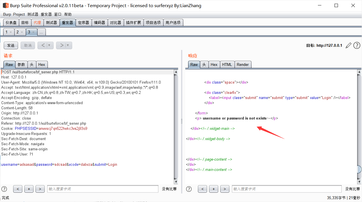 把数据包发送给重发器,点击发送,右侧响应栏提示账号密码不存在。