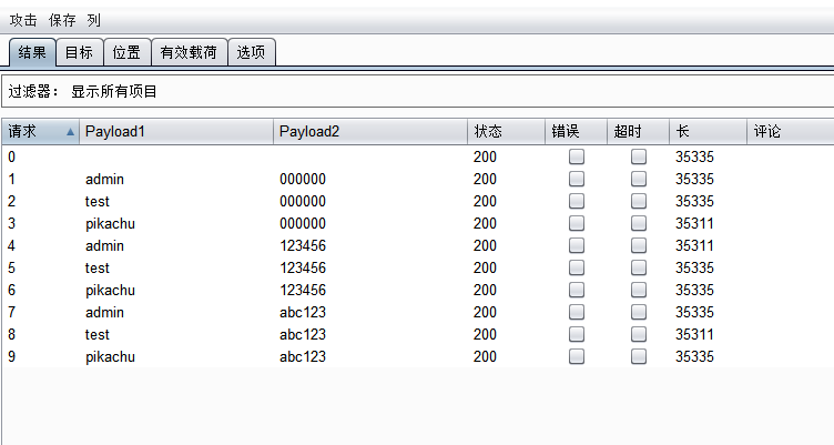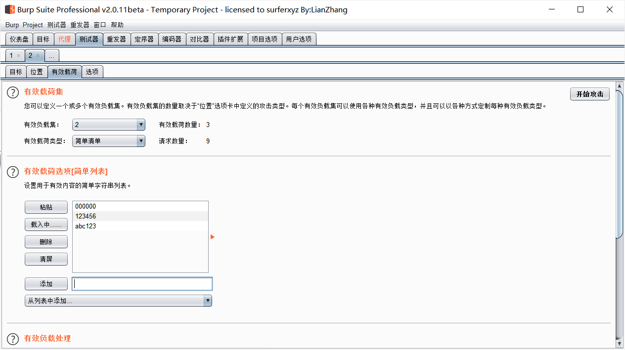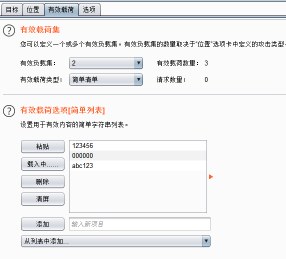第一个负载集对应账户,添加输入上面提示给的三个账户,第二个负载对应密码,