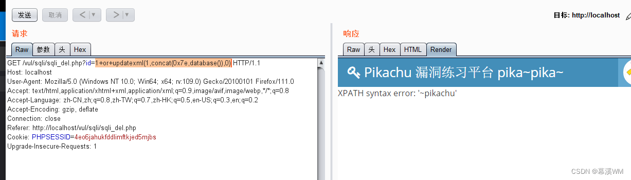 点击删除,然后用burp suite抓包,右键发送给repeater(重发器),修改数据,把id后面改成以下payload,