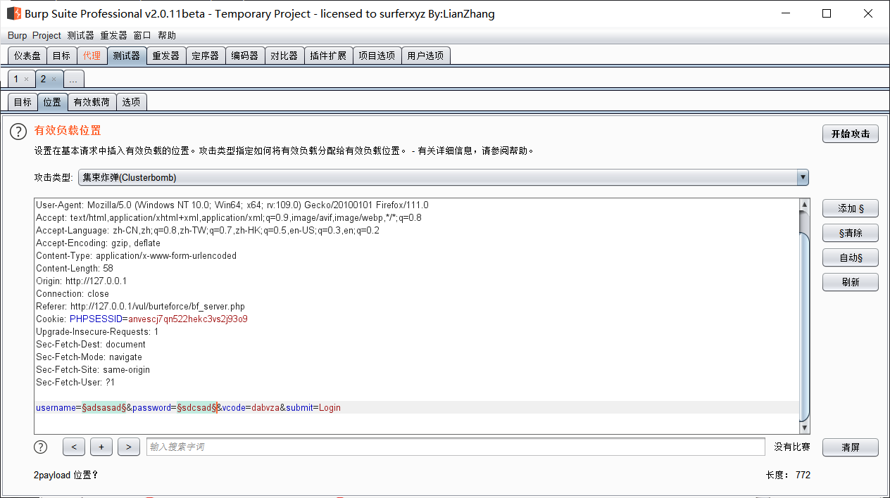 把数据包发送给测试器,因为验证码不会改变,我们输入的验证码又是正确的,所以我们只要设置账号密码两个攻击变量