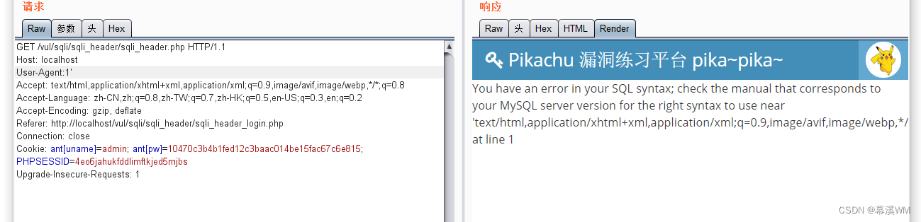 发送给repeater,修改Agent=1',出现报错,判断有SQL注入