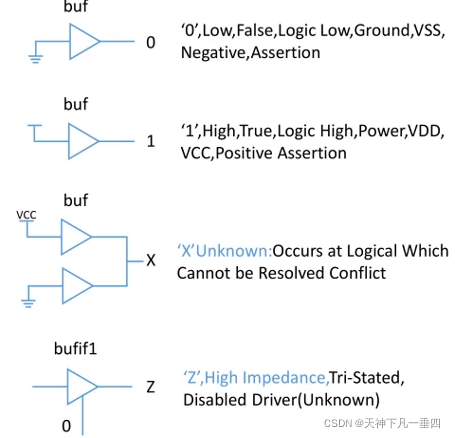 - 逻辑X:表示未知,有可能是高电平,也有可能是低电平