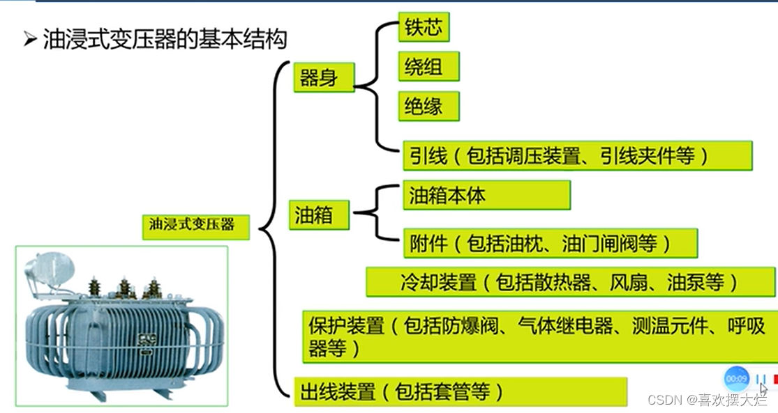 油浸式变压器的基本结构 油浸式变压器中的变压器油具有良好的绝缘性与导热性,能够解决变压器由于大容量产生的热问题以及高电压问题, 且价格低廉,在我国大部分地区都可使用。本次的主要内容就是介绍典型油浸式变压器的基本结构。可以从图中了解到油浸式变压器的主要结构有器身,油箱,冷却装置,保护装置以及出线装置。器身是整个变压器的核心部分,变压器的电流电压转换就是依靠器身中的绕组产生的电磁感应。铁芯铁芯是变压器中最基本的组成部件,构成了变压器的磁路部分,将变压器的一次绕组和二次绕组缠绕在铁芯上。