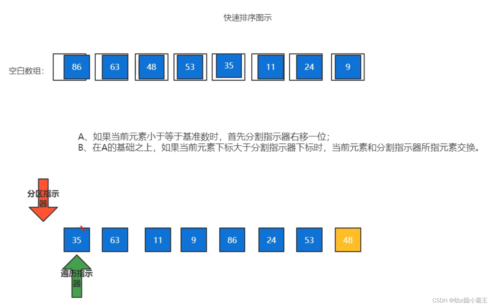 在数组中选取一个元素作为基准数,将其与数组尾元素进行交换,分区指示器初始指向的下标为数组开始下标-1,遍历指示器初始指向的下标为数组开始下标。