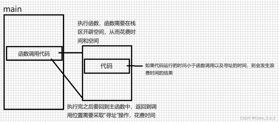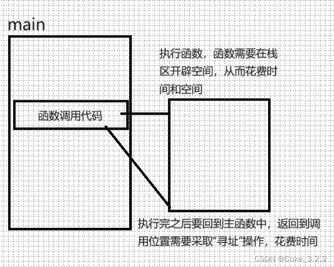 上图是函数调用的一个流程图,在我们程序运行到函数调用部分的时候,我们需要执行函数,而函数需要在栈区开辟空间,这一操作需要花费时间和空间,在执行完函数之后,需要返回到函数调用的部分,这一行为需要采取"寻址"这一操作,同时,也花费了时间。