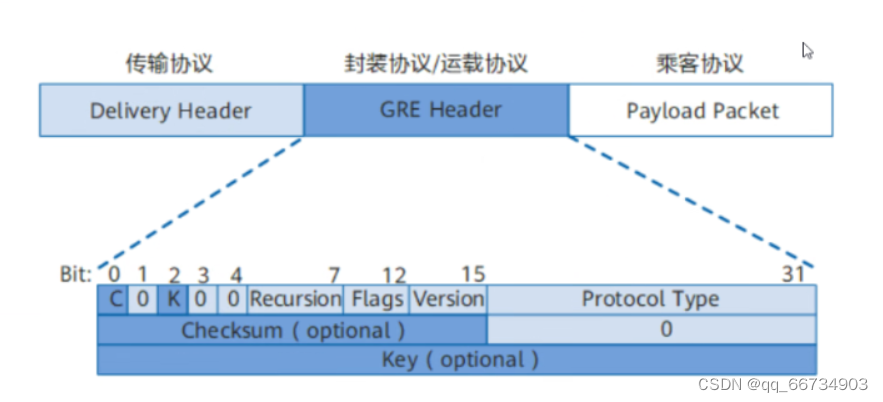 接受端设备从连接公网的接口收到报文后,首先分析ip报文头部信息,如果发现协议字段类型值为47(GRE协议号),表示数据部分由GRE模块进行处理。