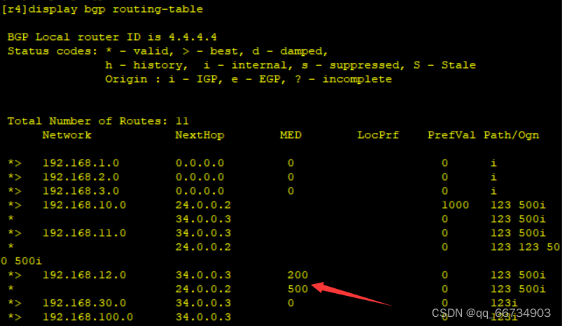 3.配置MED策略,确保R4通过R3到达192.168.12.0/24