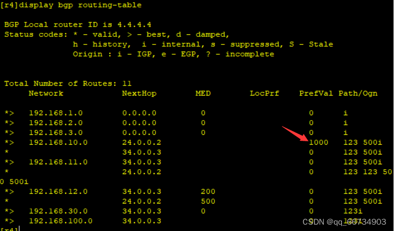 1.使用PreVal策略,确保R4通过R2到达192.168.10.0/24