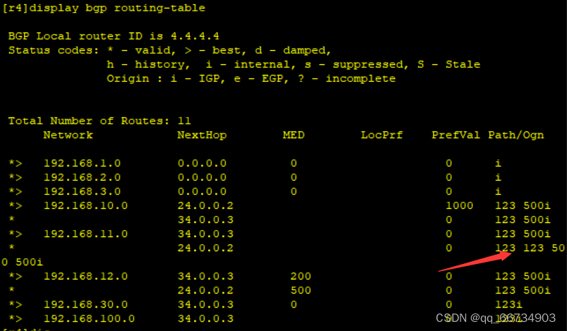 2.使用AS_Path策略,确保R4通过R3到达192.168.11.0/24