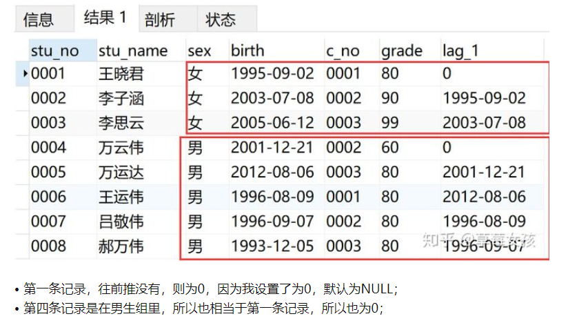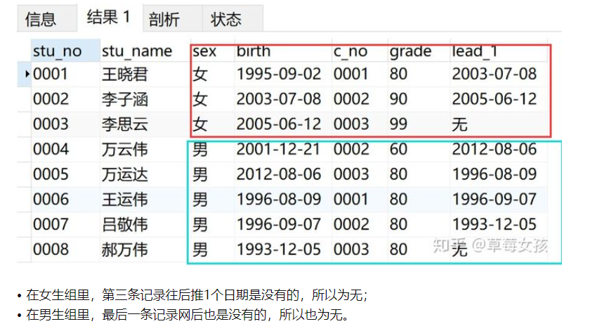 lead(birth,1,'无') over(partition by sex) as 'lead_1'