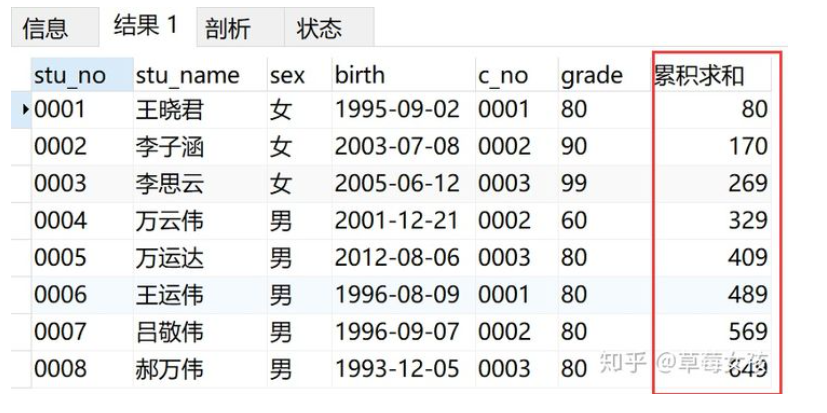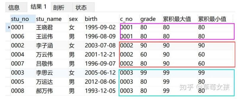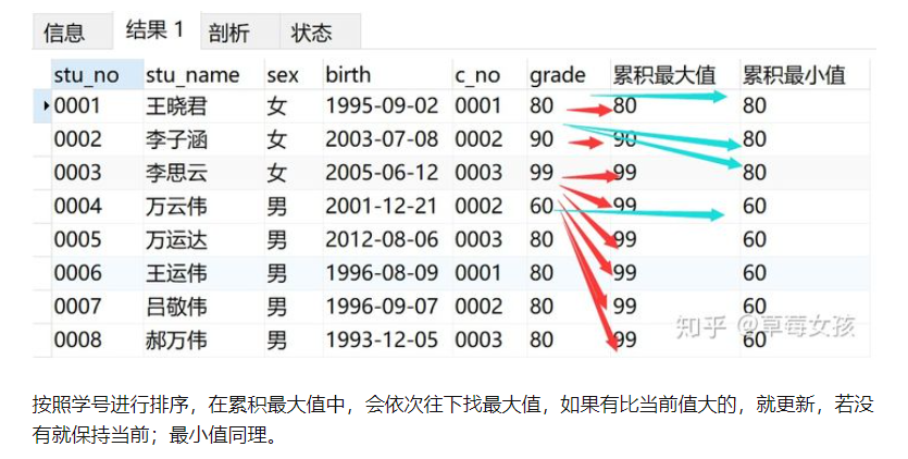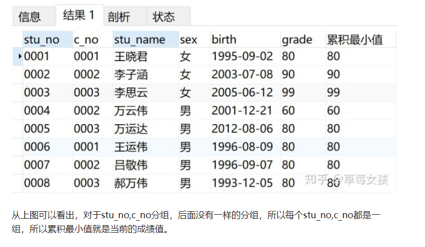 min(grade) over(partition by stu_no,c_no) as '累积最小值'