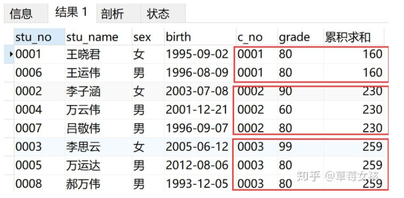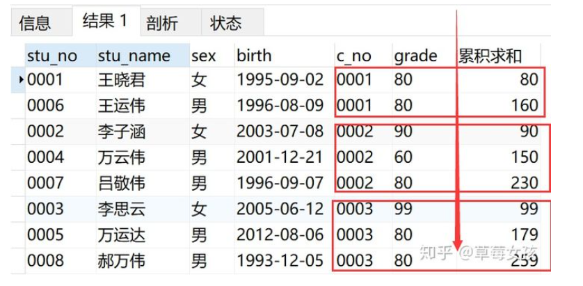 注:一定要选择根据学号排序,要不然的出来的是最终的累计求和结果,如下图: