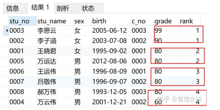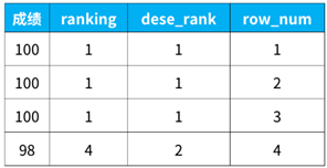 dense_rank函数在生成序号时是连续的,当出现相同排名时,将不跳过相同排名号,有两个第一名时仍跟着第二名,即排名为1,1,2这种。1,1,1,2.