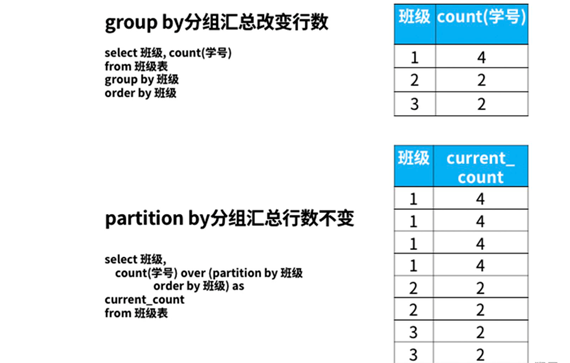 group by 分组汇总后改变了表的行数,一行只有一个类别,而partition by和rank函数不会减少原表中的行数