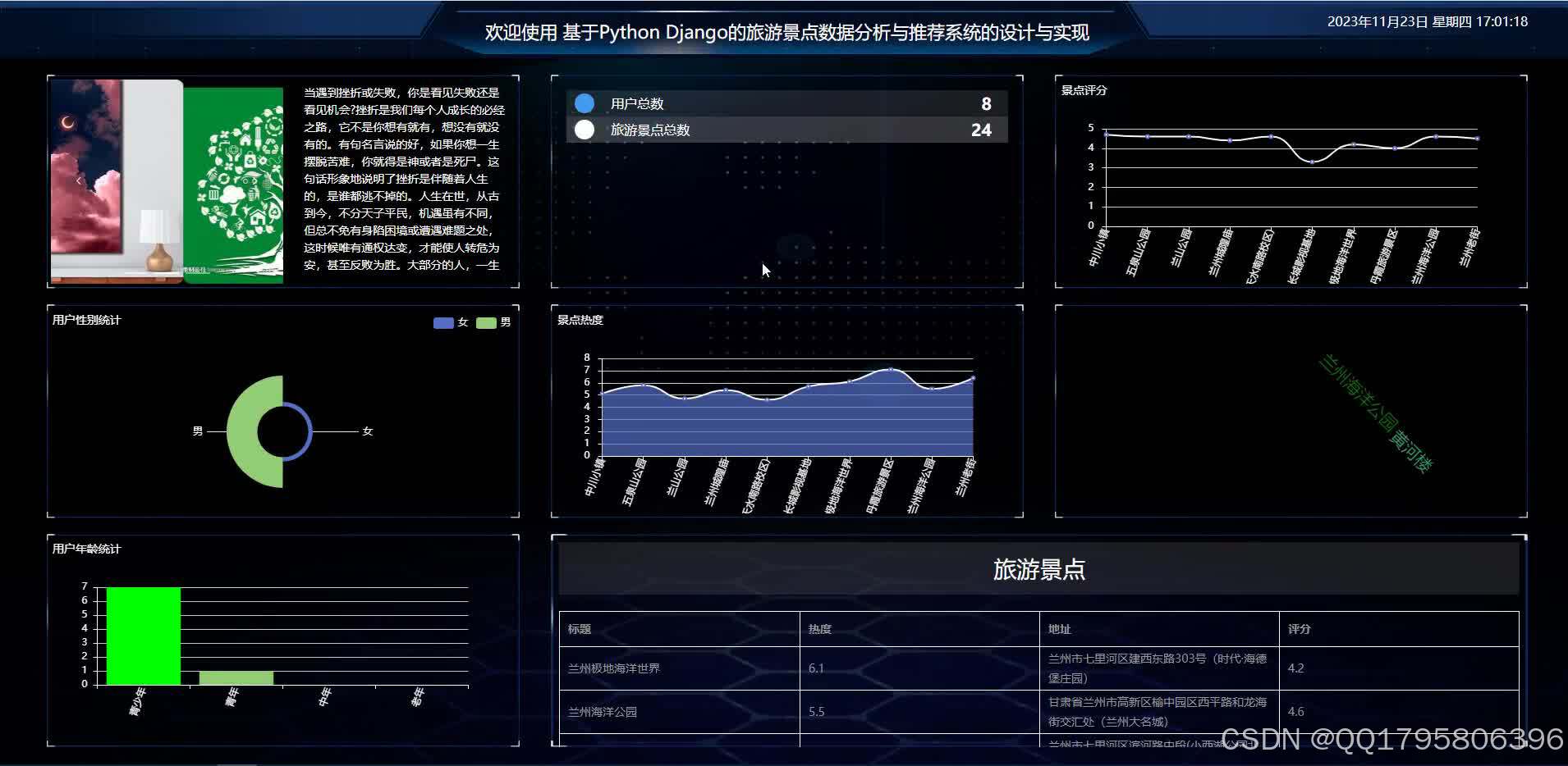 基于 Python + Django 的旅游景点数据分析与推荐系统旨在为游客提供个性化的旅游景点推荐服务,同时帮助旅游管理部门更好地了解游客需求和景点运营情况。