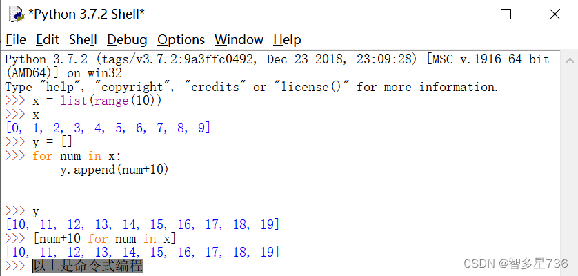 要求在IDLE中,使用交互式编程模式,编写程序,正确运行并截图显示结果。(可用命令式编程方式、函数式编程方式)