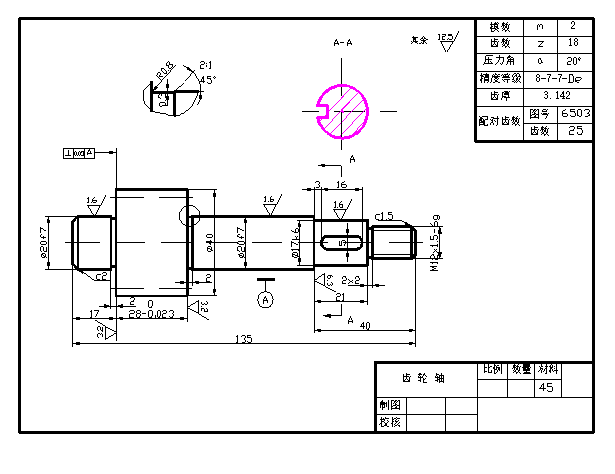 (3)指出图中的工艺结构:它有 2 处倒角,其尺寸分别为 c2和 c1.5 ,有 1 处退刀槽,其尺寸为 2×2 。
