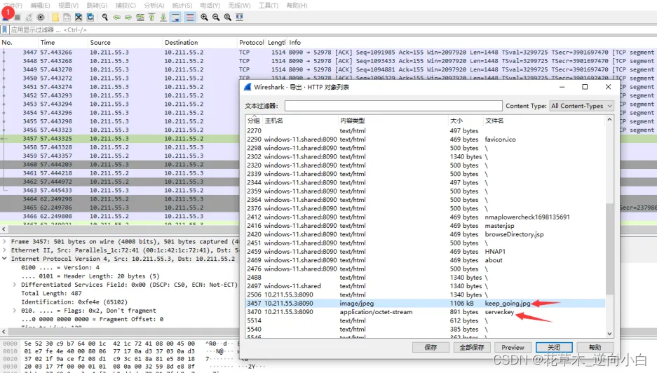 点击wireshark的文件 -》导出http对象列表。发现列表里有一张图片还有一个key文件