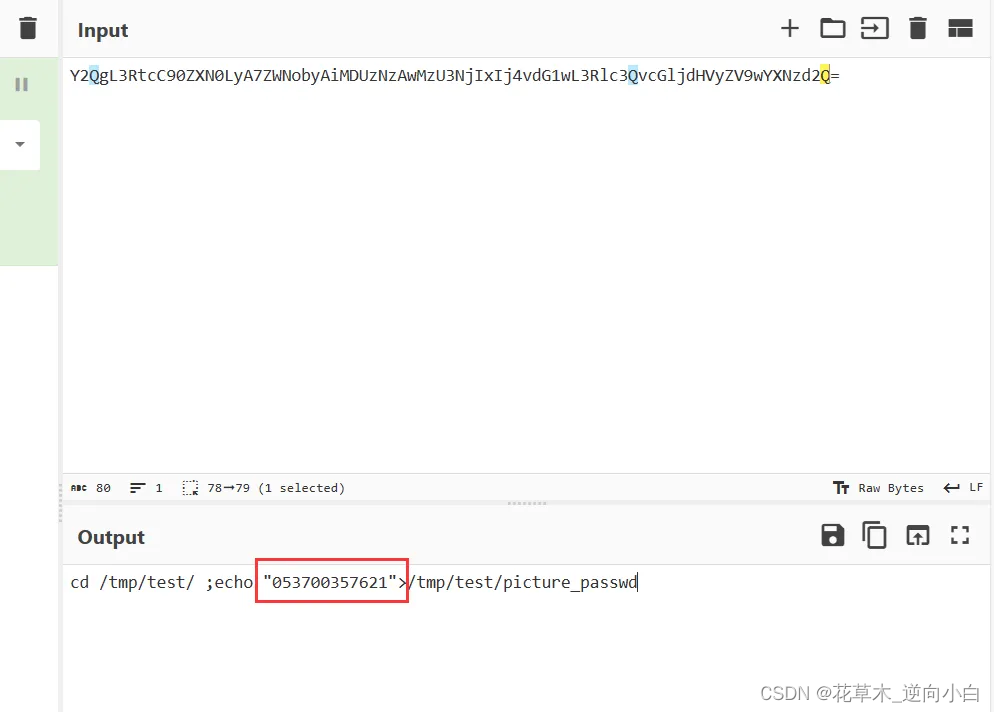 先把这段数据放入冰蝎进行解密,然后把这个cmd变量的这段base64进行解码,发现将这段串数字输入到文件中,文件名带有passwd。猜测这就是提取图片的密码