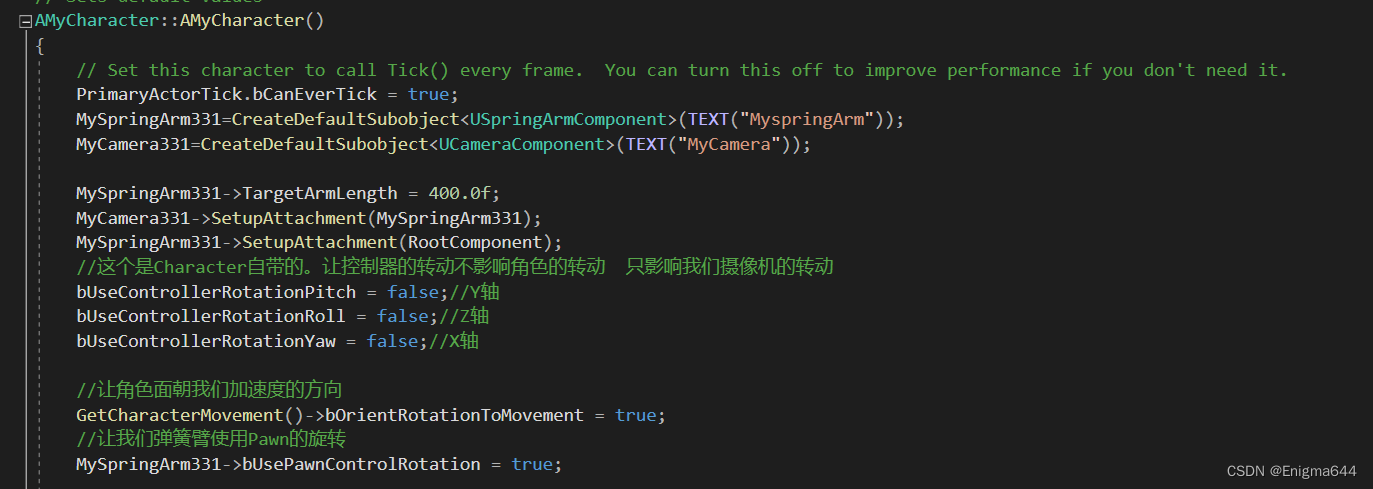 在构造函数中,我们把之前声明的Camera和SpringArm组件给他赋值。在设置一些默认值和根组件。