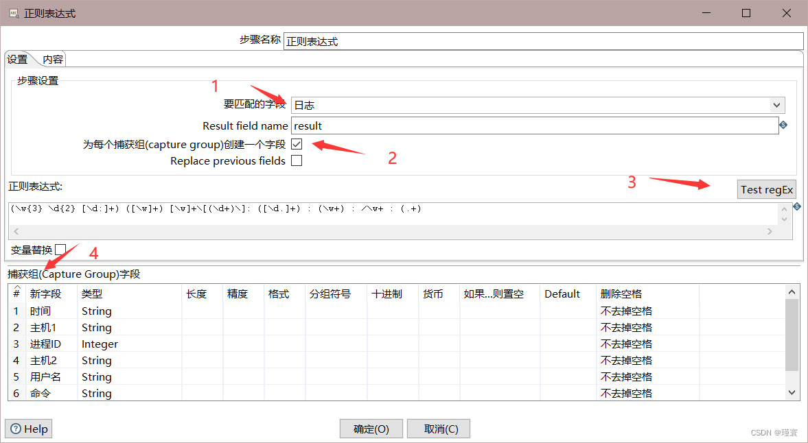 正则表达式控件的配置如图21所示,首先选定匹配的字段为日志,再选中为每个捕获组创建一个字段,接着可以使用Test regEx创建并测试正则表达式,如图22所示,最后在捕获组字段中按测试中顺序填入捕获组的字段名称和数据类型即可。