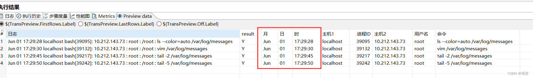 配置完成后,就可以点击左上角转换按钮进行转换。并可以在spoon界面下的执行结果栏中的Preview data中看到结果,如下图所示。
