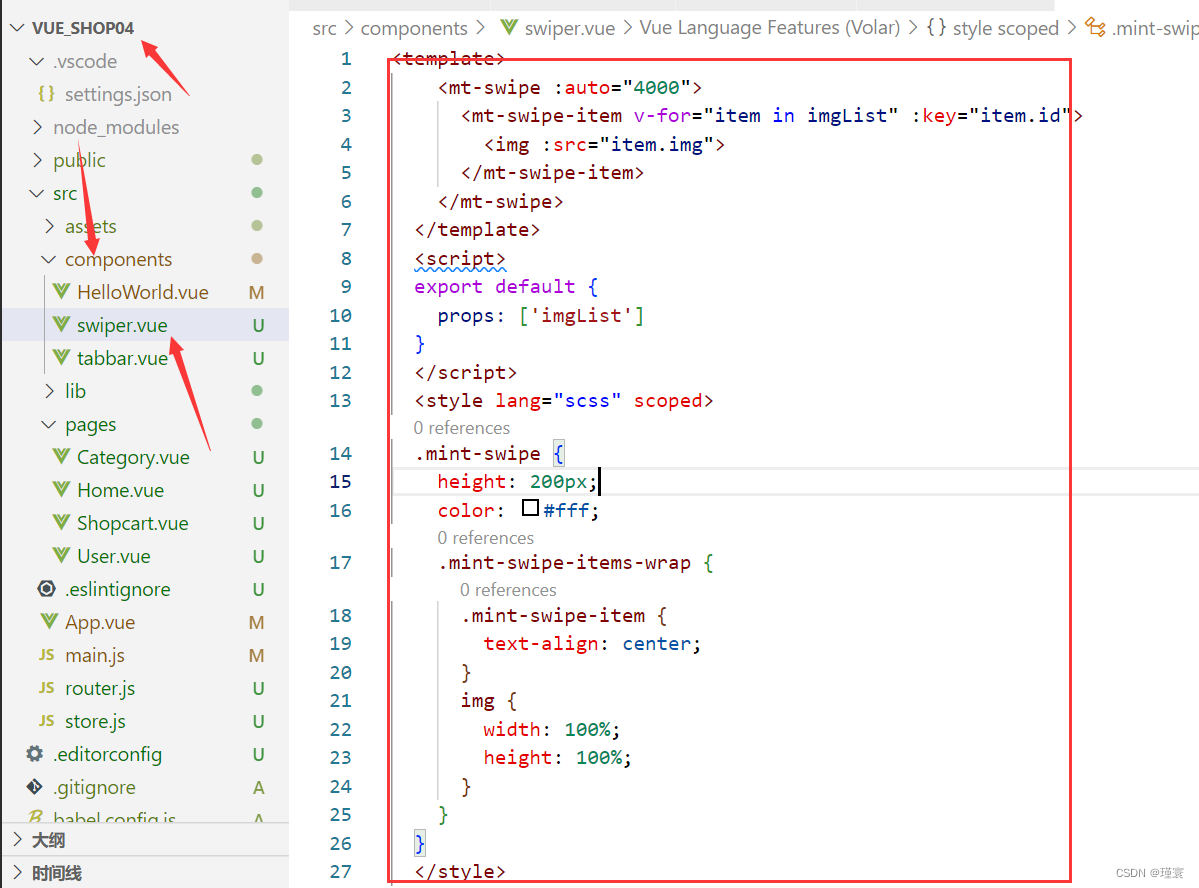 在src\components下创建swiper.vue,公共轮播图文件中,swiper.vue编写如下代码。